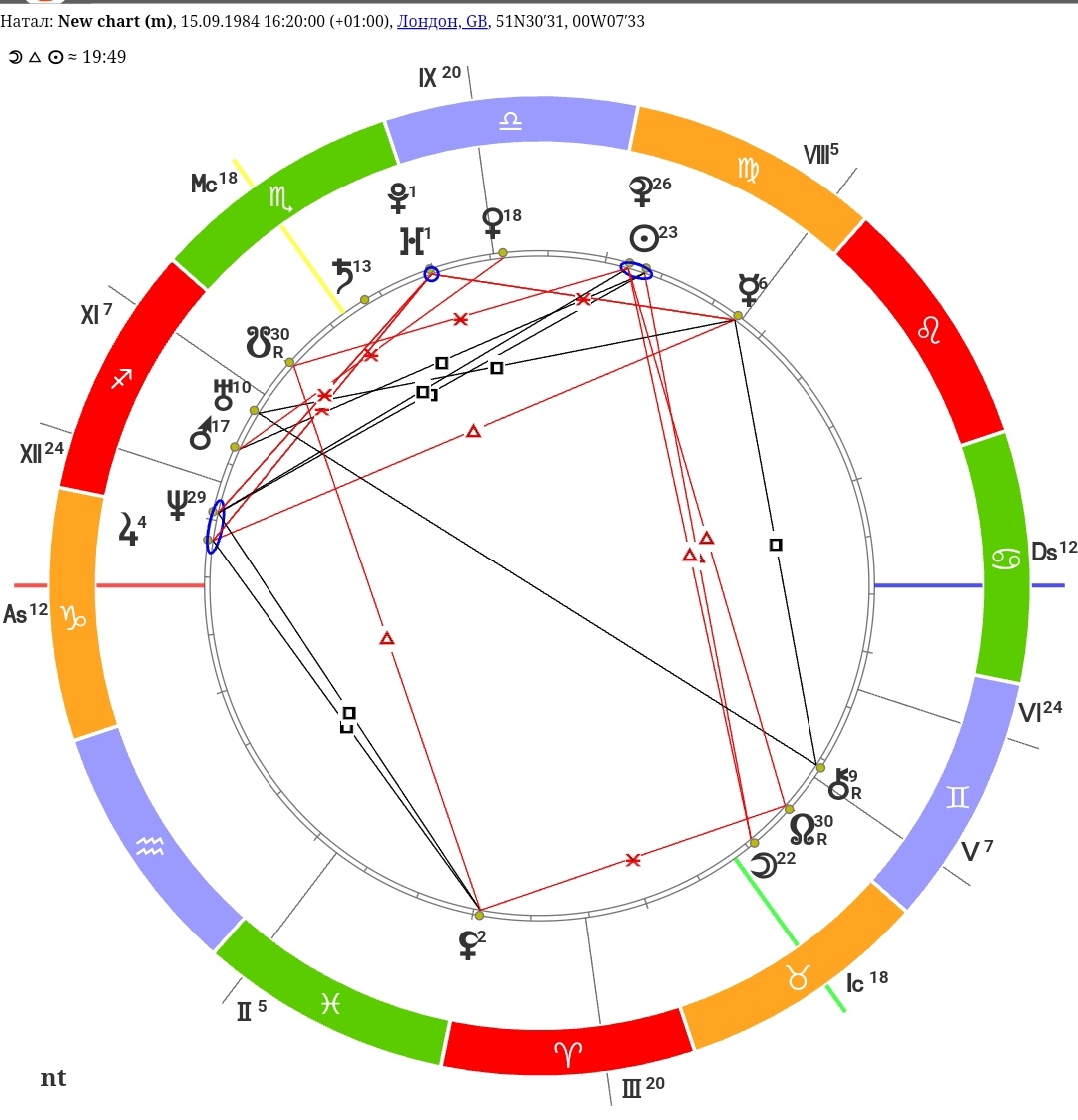 Управляет солнцем меркурий, который находится в своем знаке девы, сильный и расположился в одном доме с солнцем. Он хороший аналитик, со своей железной логикой и мнением. Четкий, чёрствый и по делу. Честоплюй до мелочей. А квадрат с ураном даёт ему оригинальные идеи, но трудно реализуемые. Он может часто менять свою точку зрения, но это не говорит о том, что он ведомый,чужую точку зрения ему не навязать. Здесь может быть бестактность и высокомерие.