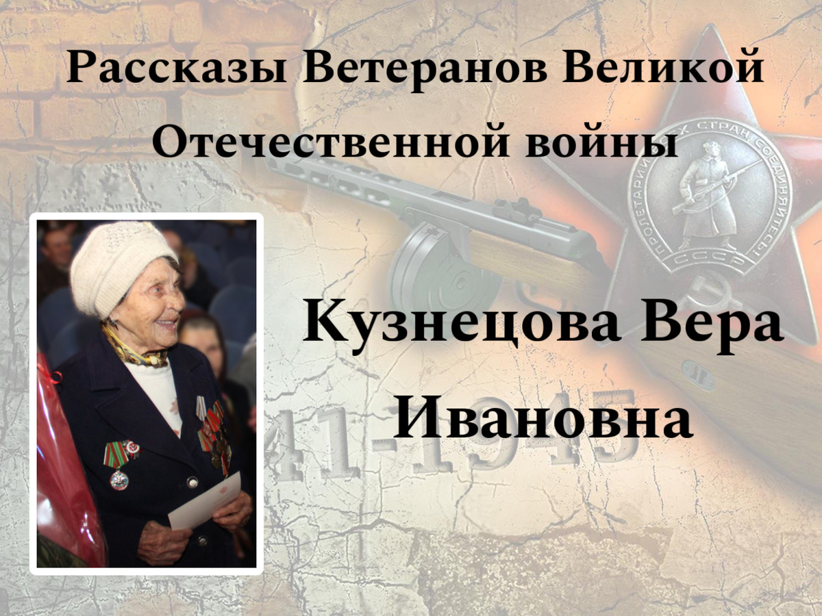 Кузнецова Вера Ивановна. Ветеран Великой Отечественной войны, несовершеннолетний узник фашистских концлагерей. Родилась 27 сентября 1930 года в Смоленской области, Дорогобужский район, деревня Федоровка. "Моя семья состояла из четырех человек. Старший брат ушел на фронт. С фронта не вернулся, погиб. Немцы оккупировали деревню и находились у нас три года. Я помню, как заставляли нас детей носить воду, для того что бы они помылись. Воду носили в ведрах на коромысле. Ходили за водой за полтора километра от дома. Там был родник и речка. Маму заставляли стирать немцам нижнее белье, пока у нас были куры, требовали, чтобы резали им куриц для еды. Я очень хорошо помню, как немецкие солдаты говорил маме: «Матка, режь курку». В один из дней фашисты, согнали всех жителей окрестных деревень, на окраину нашей деревни там были вырыты окопы. Мы сидели в окопах и ждали своей участи. Потом нас загнали в концлагерь, который был не далеко от деревни Федоровка. Жили мы в бараках, не приспособленных для