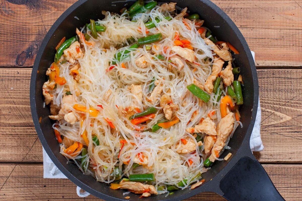 Также, соломкой, нарезаем два огурца. Помимо овощей, в глубокую миску помещаем фунчозу и заливаем её кипятком, чтобы вода полностью покрывала лапшу. Разогреваем садж на сильном огне,