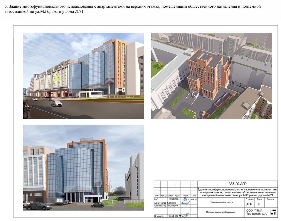 В августе 2024 г. проект многофункционального комплекса с апартаментами на верхних этажах, помещениями общественного назначения и подземной автостоянкой на улице Горького (у дома № 71, здания ГУ МВД по региону) в Нижнем Новгороде получил положительное заключение негосударственной экспертизы, сообщается на сайте ГИС ЕГРЗ. Оценивало документацию ООО «Проммаш тест экспертиза». Застройщиком выступит ООО «СЗ «Армина», технический заказчик — топливная компания «Волгатрансойл». Как следует из материалов с сайта минградразвития региона, проект «СЗ «Армина» рассматривали на заседаниях архитектурного совета в 2020 и 2023 г. Изначально работа над ним была отложена до согласования проекта с ГУ МВД России по Нижегородской области в части соблюдения требований антитеррористической защищенности данного объекта. На тот момент застройщик предоставил совету следующий графический материал: В прошлом году архсовет посчитал возможной дальнейшую проработку представленной концепции: Справка По данным портала