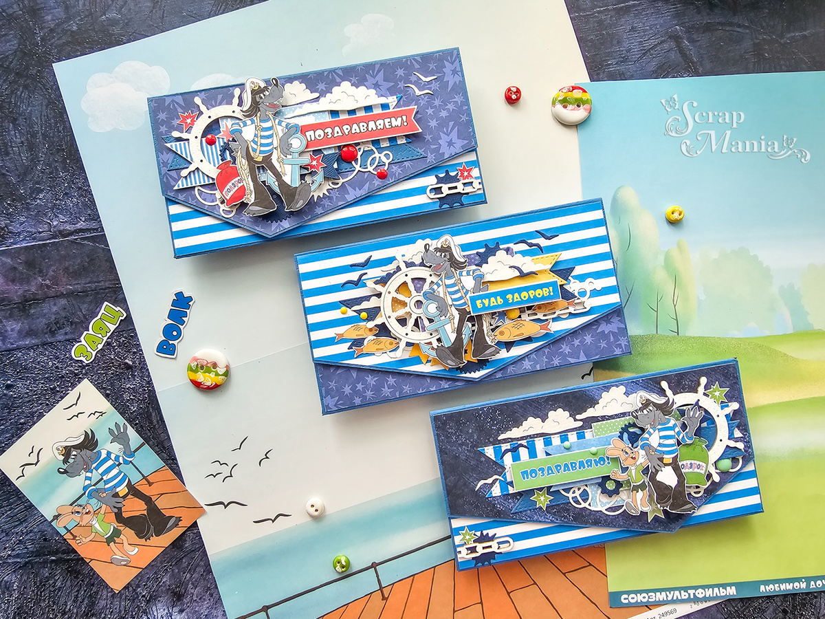 Добрый и веселый день, дорогие друзья! Веселый - потому что я, Елена Верес, от души повеселилась, создавая "группу конвертов в полосатых купальниках" (как я их про себя называю) из невероятной, крутой, озорной и такой родной и любимой коллекции "Ну, погоди!". Когда я ее увидела, у меня сразу возникла идея подготовить тематические подарочные конверты для тех, кто помнит самый лучший мультик нашего детства. Например, для музыкантов с гитарами, распевающих "Под крышей дома твоего", или для спортсменов в синих костюмах, тренирующихся под звуки радио: "Мы начинаем утреннюю зарядку". Конечно, новогодние с волком в образе Снегурочки. Вы наверняка сразу стали напевать "Расскажи, Снегурочка, где была?". В общем, идей масса! Очень уж вдохновляющая коллекция! А начать я решила с подарочных конвертов для настоящих морских волков - суровых моряков в тельняшках. Конечно же, с волком в главной роли! Волков (как впрочем и зайцев) в коллекции на любой вкус: они есть в высечках, в наборе для вырезания,