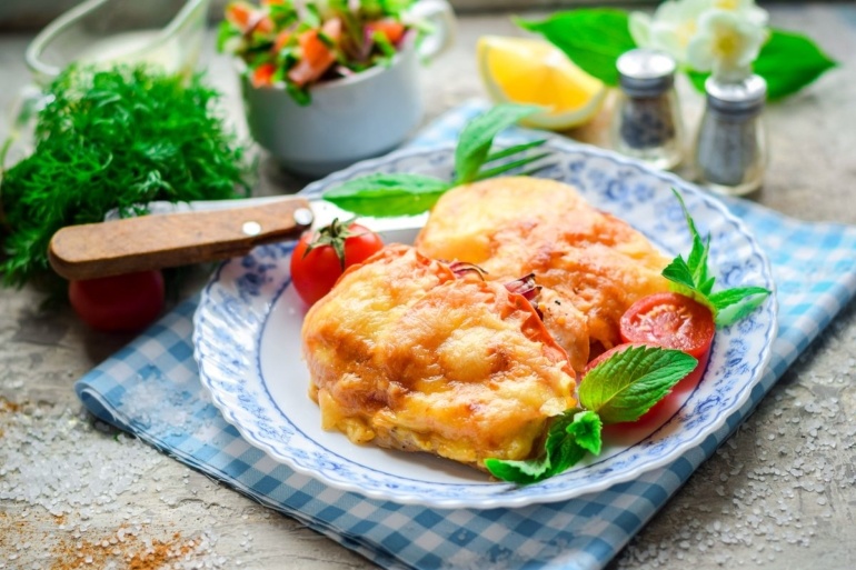 Включаем духовку для разогрева до температуры 180 градусов. Пока варятся яйца, каждое куриное филе разрезаем вдоль на 2 части. Отбиваем филе кухонным молотком через пищевую плёнку в пласт толщиной около 1 см.