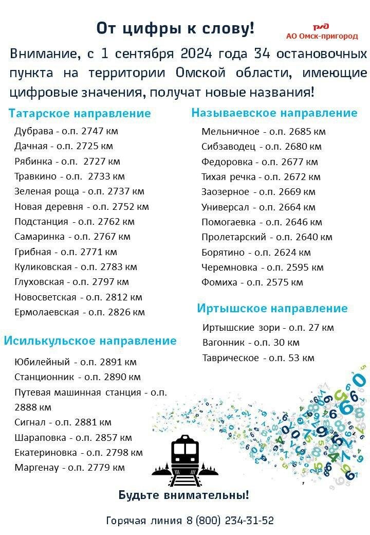 С 1 сентября 2024 года в Омской области практически не останется станций с привычными многим названиями типа «2666-й километр». Западно-Сибирская железная дорога готовит массовое переименование. Всего, как сообщили в минтрансе Омской области, новые названия получат 34 станции. Имена для них выбирали по ближайшим географическим ориентирам, например, в честь деревень и водных объектов. Есть в этом списке и станция Фёдоровка у будущего аэропорта — остановочный пункт 2677 километр. Впрочем, иногда от географического принципа отходили. Так, остановочный пункт 2771 километр переименуют в Грибную — потому, что в соседних лесах много грибов. Стоит заметить, что переименование станций будет происходить не автоматически. Для начала эти предложения внесут в местные администрации, и уже потом, после их одобрения, завершат процедуру. Так что теоретически, хоть и крайне маловероятно, список может ещё измениться. В любом случае для того, чтобы пассажиры не растерялись и не проехали свою остановку, пе
