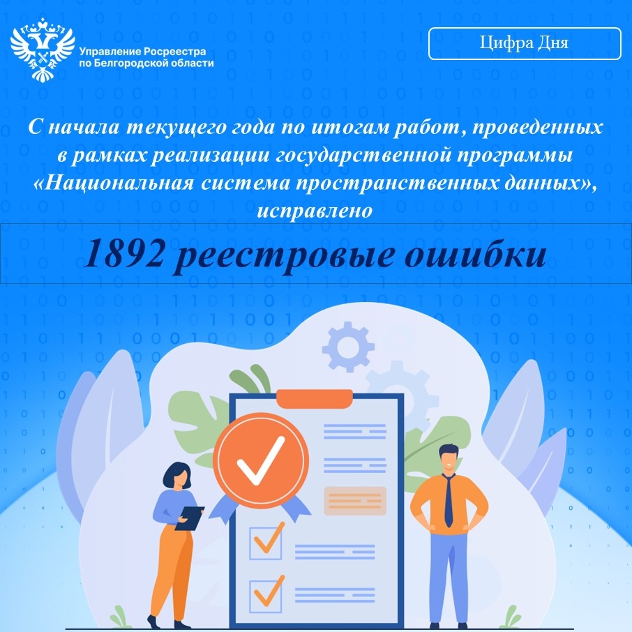 В рамках постоянной рубрики #ЦифраДня Управление Росреестра по Белгородской области информирует, что с начала текущего года по итогам работ, проведенных в рамках реализации государственной программы «Национальная система пространственных данных», исправлено 1892 реестровые ошибки в сведениях Единого государственного реестра недвижимости.