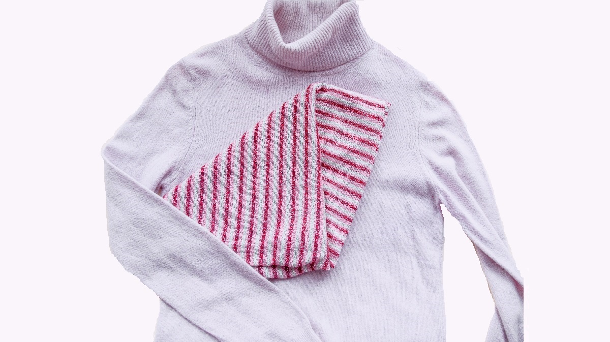 Здравствуйте! Апсайклинг — это переделка одежды, обуви, аксессуаров и создание из них вещей, которые можно использовать и дальше. Переделка и повторное использование вещей сегодня — это всегда новая и полезная, модная и актуальная одежда. Переделать имеющуюся вещь часто дешевле, чем купить новую или сшить её с нуля. Так что апсайклинг помогает экономить. И немаловажно это для экологии, ведь производство одежды негативно влияет на окружающую среду. В этой статье хочу рассказать, как интересно переделала свой любимый свитер. У меня был розовый свитер, который носила не так часто из-за пятнышек на самом видном месте. Потом уже пригляделась внимательно, поняла, что это не пятна, а в этих местах почему-то прохудилась шерсть. Свитер идеально хорошего качества, в составе имеется шерсть и кашемир, носила очень мало, такую вещь жалко не носить, поэтому решила немного поапгрейдить. У меня как раз давно лежал трикотаж в паттерн с разноцветной полоской, как раз очень хорошо сочетается с этим свите