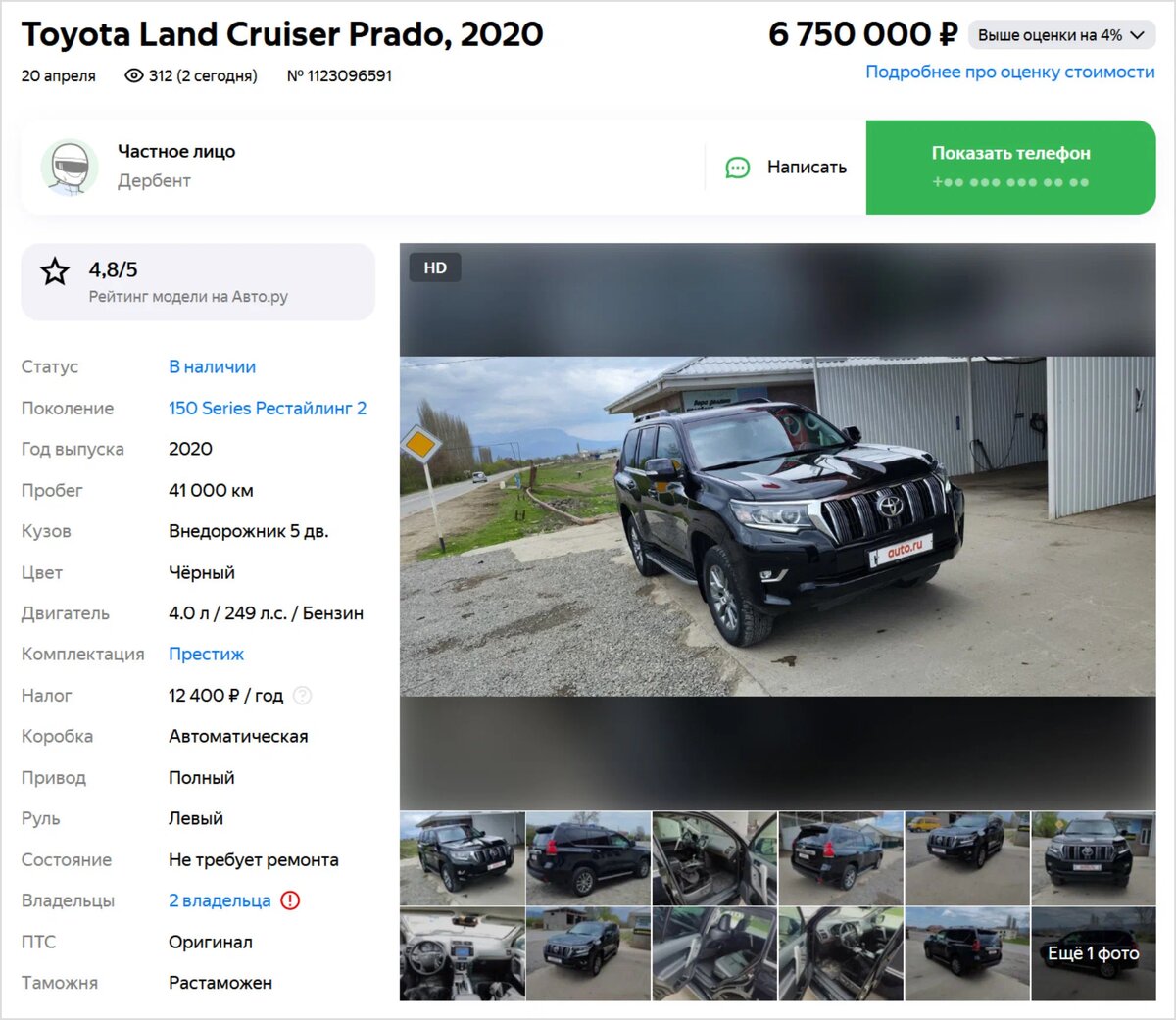 Автомобили бренда Toyota в рубрике «Не бит, не крашен» встречаются реже, чем, например, машины BMW. Хотя на дорогах «японцев» гораздо больше, а на Авто.ру они занимают второе место по численности после Лад. Исправляемся! Тем более нам подвернулся очень интересный экземпляр — брутальный Land Cruiser Prado. Что может быть не так с этим внедорожником? Свежо выглядящий автомобиль продают в Дагестане. Это экземпляр 2020 года выпуска, который проехал немногим более 40 тысяч километров. Цену машины с четырёхлитровым бензиновым мотором низкой не назовёшь — 6 750 000 рублей. На фотографиях придраться не к чему — Prado выглядит так, как и должен выглядеть для своего возраста и пробега. А продавец и вовсе пишет, что внедорожник пребывает в состоянии новой машины. В комментарии говорится и о том, что машина не избежала малярных работ. Само по себе это, конечно, не повод отказываться от покупки автомобиля. Но действительно ли его загоняли на ремонт только для наведения марафета? Открываем Отчёт Авт