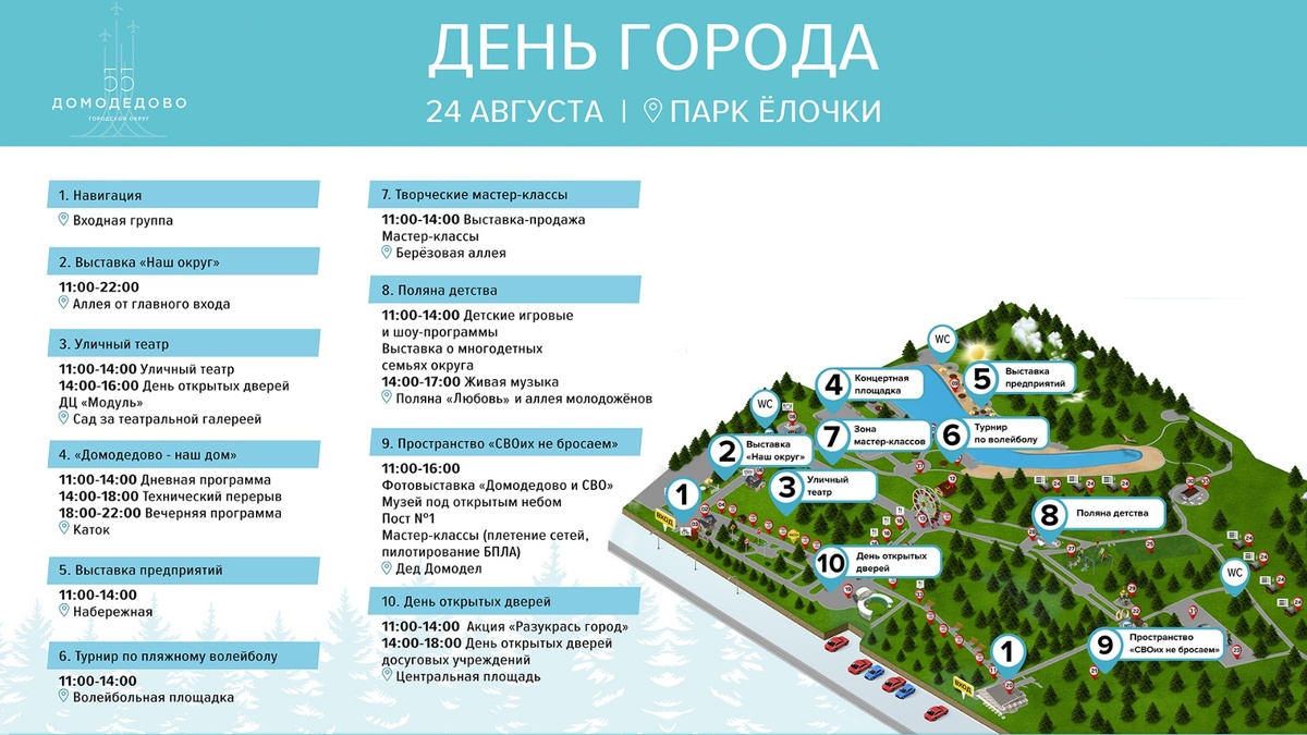 24 августа отметим 55-летие нашего округа Домодедово. Праздник пройдёт в городском парке «Ёлочки» (0+) Конечно, День округа – долгожданный, главный праздник года для всех, кто любит Домодедово. В этом году торжество будет ещё и юбилейным – нашему округу исполняется 55 лет. Отмечать юбилей будем в парке культуры и отдыха «Ёлочки». Гостям предложат много интересных площадок и активностей. С жителями и гостями округа праздник разделят звёзды российской эстрады. – Вся территория парка «Ёлочки» будет разделена на тематические зоны, в каждой из которых организуем отдельную программу, – прокомментировала важное событие глава городского округа Домодедово Евгения Хрусталева. На центральной площади В 11.00 на центральной площади парка начнётся акция «Разукрась город» (0+). А с 14.00 до 18.00 состоится «День открытых дверей» досуговых учреждений городского округа. С 14.00 до 16.00 пройдёт «День открытых дверей» и в досуговом центре «Модуль» (0+). Для маленьких домодедовцев В этот день поляна «Люб