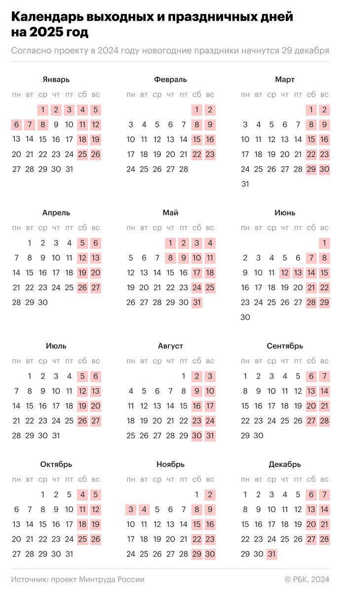В 2025 году россиян ждет 11 выходных на Новый год и по четыре дня на 1 и 9 Мая. На июньские праздники также будет четыре выходных На новый 2025 год россияне будут отдыхать 11 дней — с 29 декабря 2024 года по 8 января 2025 года, говорится в проекте постановления Минтруда.