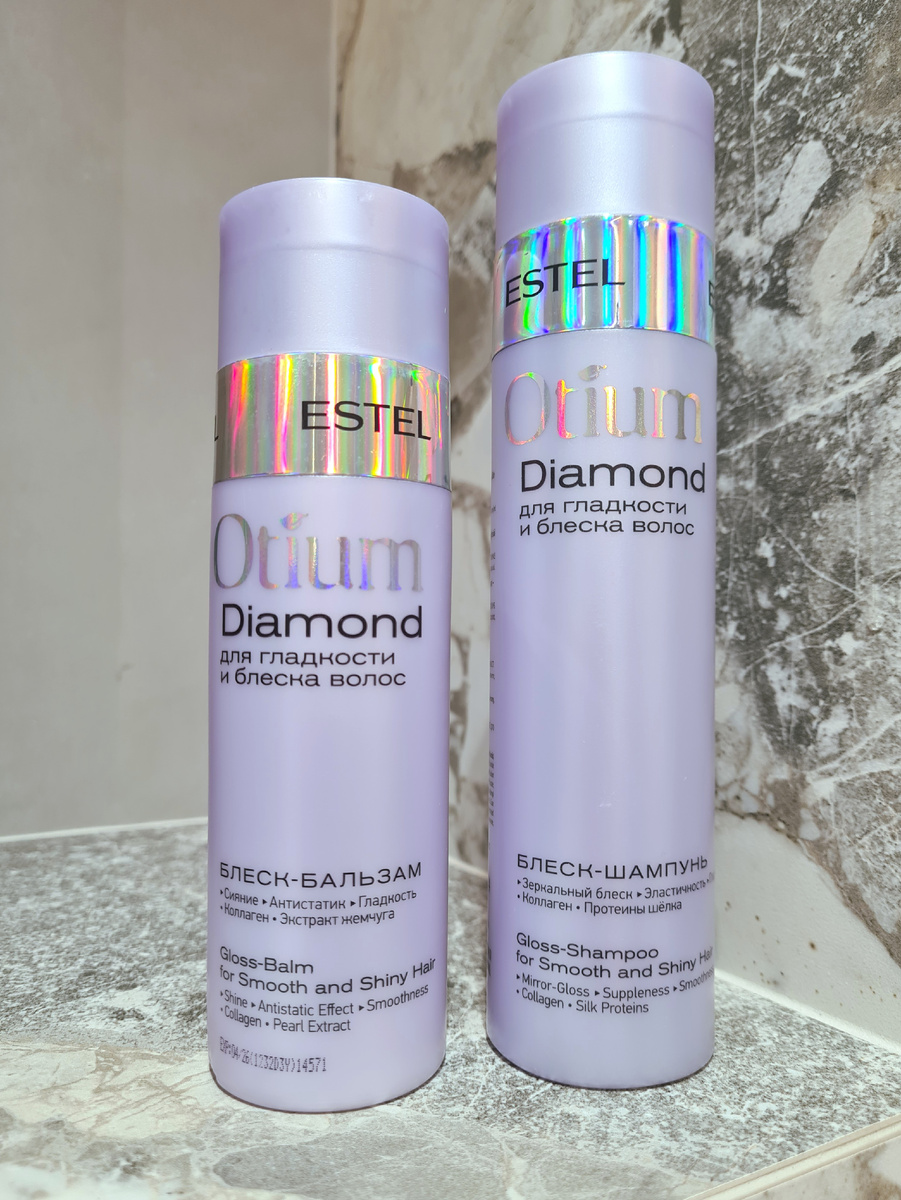 Привет! Отзыв на шампунь и бальзам для блеска и гладкости волос от Estel, серии diamond. Продаются как по отдельности, так и в наборе в подарочной коробке. Estel та марка, которая не нуждается в представлении. Большой ассортимент, приятные цены, профессиональный и домашний уход. Шампунь объёмом больше бальзама. Отдушка у средств одинаковая, необычная, приятная, с кокосовым/пляжным нюансом. Аромат сохраняется на волосах до вечера. Дозатор удобный. Консистенция шампуня в меру густая, подается из дозатора хорошо. Имеет перламутрово-жемчужный оттенок. Хорошо пенится и распределяется. Если у Вас не окрашенные волосы - можно использовать шампунь без бальзама. Шампунь хорошо питает, разглаживает. Очищающие характеристики средние, в случае сильных загрязнений стайлинговыми средствами - двойное мытье. Бальзам густой. Дозатор не справляется со средством, тубу приходится с силой сжимать. Храню вверх дном, чтобы бальзам был непосредственно у носика. Когда средство заканчивается, приход