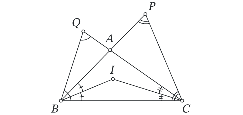 Выберите все верные равенства. 1. BP=CQ По равным углам при основании, мы можем утверждать что треугольники BPC и BQC равносторонние. При чем BP=BC и CQ=BC, из чего однозначно следует, что BP=CQ. 2. BI=IC 3. BI=IP 4. BI=IA 5. BI=IQ Рассмотрим треугольники CIQ и BIC. Они равны по 2м сторонам и углу между ними - сторона CI общая, CQ=BC это мы уже выяснили, и углы С равны по условию. Выходит, что в треугольнике BQC углы B и Q образованы путем вычитания из угла обозначенного душкой угла обозначенного перечеркнутой душкой, а значит углы равны и треугольник равнобедренный. 6. ∠BIC=∠BIP Рассмотрим треугольники BIC и BIP, углы В равны по условию, BP=BC это мы уже давно поняли и сторона BI общая - треугольники равны, а значит и соответствующие угла равны. 7. ∠BIP=∠CIQ Рассмотрим треугольники BIC и CIQ. Они равны. То что CQ=BC мы знаем еще с первого пункта, сторона CI общая и угол между ними равен по условию. Пунктом выше мы выяснили, что треугольники BIC и BIP равны, значит равны и CIQ и BIP,
