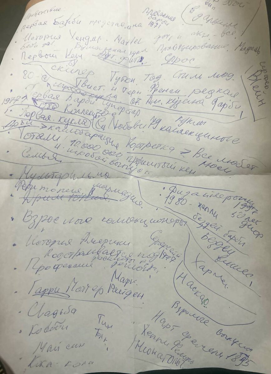 Hi, Barbie! Каюсь-каюсь! Ошарашила новостью о новой работе и пропала на две недели! Но не ругайтесь! Эти дни были действительно тяжелые, не до Дзена было. Но в телеграмме я ежедневно отчитывалась, и держала в курсе, что со мной происходит. Подпишитесь) мне будет так приятно! Сейчас все расскажу! Суббота 10.08.24 Мой первый стажировочный день! Еду в музей с мыслями о том, что много чего знаю и что все будет хорошо, но панику никто не отменял! Экскурсовод мне все показала, и рассказала обзорную экскурсию. Оказалось, что я вообще ничегошеньки не знаю! Села в уголок выписала то, что запомнила и экскурсовод повторила мне экскурсию и мой конспект выглядел примерно так: В голове было также и тут я реально запаниковала!!! Я думала, что зря все это затеяла и что не нужно было менять работу! Решила что не справлюсь и ужасно испугалась от нахлынувшей меня информации! А потом мне показали хранилище кукол! Коробки с куклами до потолка... Такое можно увидеть только в магазине игрушек! Всякие куко