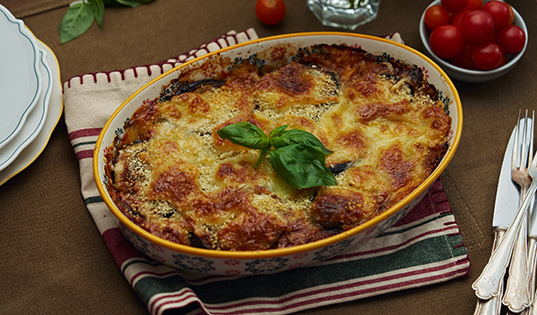 Моцарелла 150 г (заказать все продукты для приготовления в 1 клик) 1. Подготовьте все ингредиенты. 2. Разрежьте баклажаны на ломтики толщиной 1 см. Разогрейте сковороду-гриль и обжарьте баклажаны с обеих сторон. 3. Очистите и мелко нарежьте лук и чеснок. В сковороде разогрейте оливковое масло и обжарьте лук и чеснок с сушеным орегано в течение 10 минут, пока они не станут золотистыми. Добавьте томаты. Дайте овощной смеси прокипеть на небольшом огне 15 минут. Приправьте солью и перцем. Добавьте капельку уксуса и баз