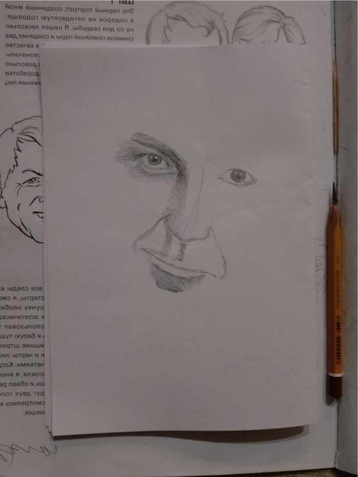 Рисовал в несколько этапов, получилось каждый сфотографировать и увидеть некую раскадровку, также некий стиль/схему моего подхода к рисованию портрета, в этот раз начал с глаз, хотя бывает и по-другому, иногда с овала, иногда снизу вверх, по-разному, сам пока не понял от чего зависит. Тут в общей сложности времени заняло около двух часов, отвлекали, поэтому были перерывы, каждый подход 10-20 минут. Узнаваем ли получился, что-то вроде есть?