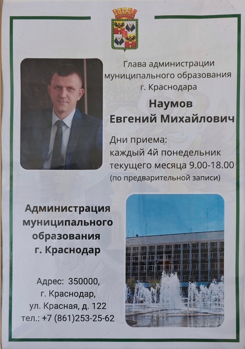 Я делал фактически с десяток обращений в ГП РФ, участвовал на личном приёме у прокурора города Краснодара А.В. Лихонина 17 июля 2024 г., который обещал на приёме организовать личный прием с Е.М. Наумовым, однако я получаю одни отписки, но на прием к мэру так и не попал!