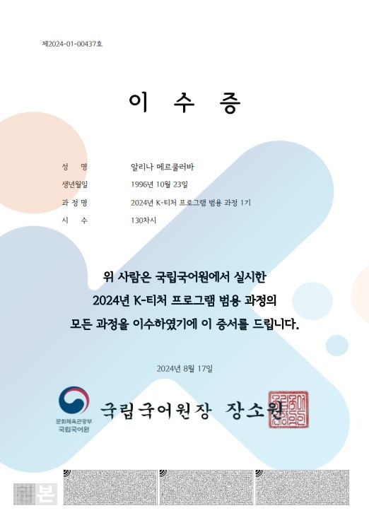 Буквально сегодня получила сертификат об окончании программы K-teacher 🥳 5 месяцев, 130 часов обучения и очень сложный экзамен, который я сдала в пятницу. Он состоял из 80 тестовых вопросов по всем темам программы, в которых чаще всего надо было найти или верный, или неверный вариант, либо вставить нужное в пропуски. Было оочень много новой сложной информации, часть из которой, конечно же, уже забылась, поэтому эти 120 минут экзамена были полны страданий 🥲 Для прохождения курса и получения сертификата нужно было пройти минимум 80% теории (80/100 часов), 95% практики (28/30 часов) и, собственно, сдать экзамен. После этого сертификат появился у меня в личном кабинете. В практической части, кстати, были видео с планированием и проведением уроков для начального и среднего уровня, как общих, так и функциональных (отдельно 듣기, 쓰기 и т. д.) от корейских преподавателей на языковых курсах. Это было, наверное, самое полезное 🤩 Моими любимыми курсами стали: А нелюбимыми: А самый главный пр