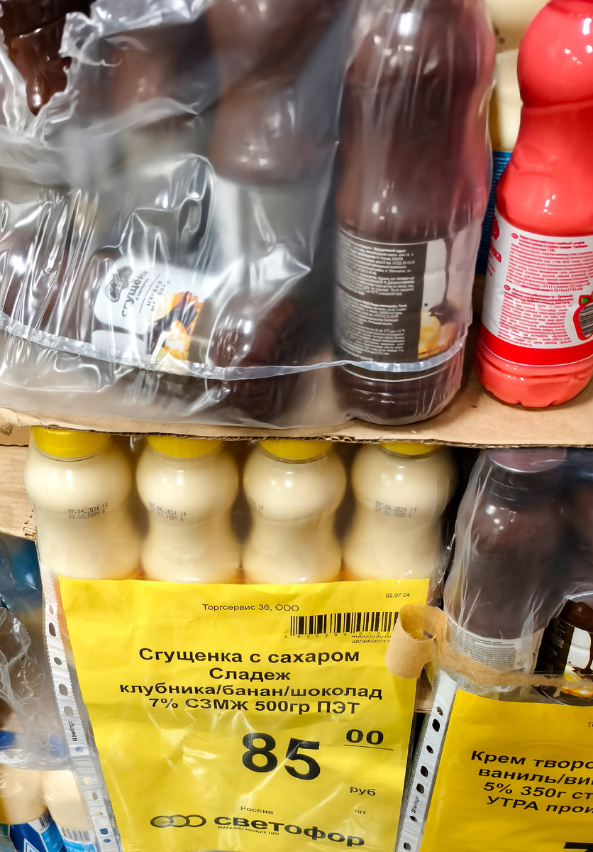 Всем привет! Купил на пробу такую сгущёночку со вкусом клубники. Была ещё с бананом и шоколадом, но я решил пока остановиться на одном варианте. А то вдруг не зайдет. И судя по цене в 85 рублей за 500 граммов будет именно так. Настоящая сгущенка сейчас стоит немного больше). Но бывают исключения и может это будет вкусно. Сгущёнка с сахаром от бренда "Сладеж". Типа балдёжная, но сладёжная. Изготовитель: ОАО "Белмолпродукт", г. Белгород. Состав не внушает доверия. Ну это и не настоящее сгущённое молоко, а продукт на молочной основе сгущеный с сахаром. В общем какой-то десерт. Даже по консистенции масса не похожа на сгущёнку. Больше похоже на йогуртную массу. Вкус не понравился. Когда я попробовал массу сразу пришла на ум одна ассоциация. Детская зубная паста со вкусом клубники. Детская паста она без мятного эффекта. И эта сгущенка почти на 100 % совпала по вкусу с пастой. А детскую пасту я недавно попробовал, когда случайно перепутал свою и пасту ребенка. Брать такой товар не сов