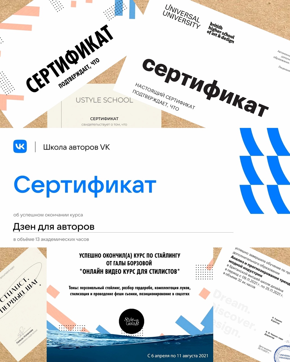 После завершения курса Галы на энтузиазме проучилась на бесплатном курсе «Стилист. Первый шаг» в Школе стиля Лейсан Усмановой Ustyle School. Там научилась психологическим приёмам работы стилиста. Тоже весьма полезные навыки.