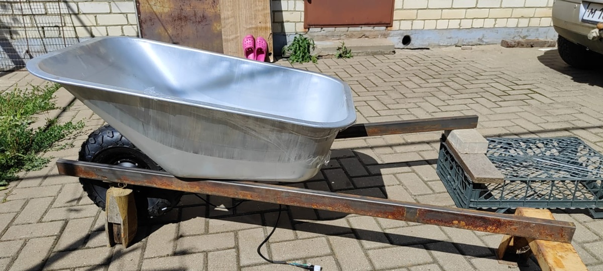 Очередной заказ электротележки оказался своеобразный, поэтому решил поделиться процессом сборки. Выставил всё на нужную высоту и ширину Сдедал крепления для моторколёс и симметрично приварил к профиля. Выставил корыто и рейкой по центрам его отверстий наметили место перемычек. Приварил перемычки под крепление корыта, разметил и просверлил отверстия под него отверстия Выставил, что бы все перемычки были паралельно По высоте, как с моторколесом выставил, чтобы замерить на каком уровне поставить ручки. Приварил 20 см полдюймовые трубки на ручки. Под таким углом мне показалось удобно. Померял с корытом, которое купил в магазине "Все инструменты" на 140 литров Вырезал под 45° заготовки для платформы, состыковал и выставил. Прихватил, замерял диогональ, и обварил. Выставляем платформу на корпус для присоединения к ней перемычек. Привариваем первую перемычку, опираясь на бампер корпуса. Вторую на переднее крепление корыта. А на третью перемычку у меня не хватило профиля. 2 хлыста