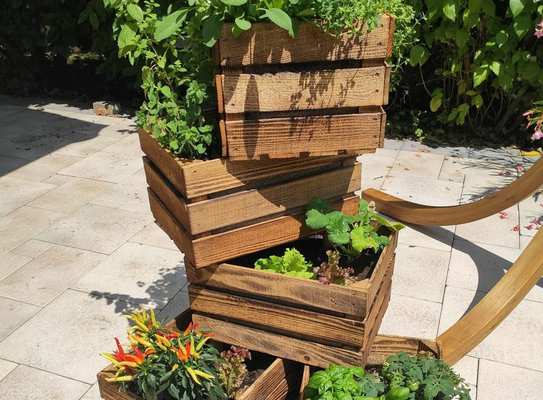 Кстати, вертикальные грядки можно сделать и из досок. Или набрать деревянных паллет бесплатно на любой свалке у крупного торгового центра и сделать из них целый комплекс для зелени и бобовых. Места занимает мало, а урожая не меньше чем с обычного огорода.