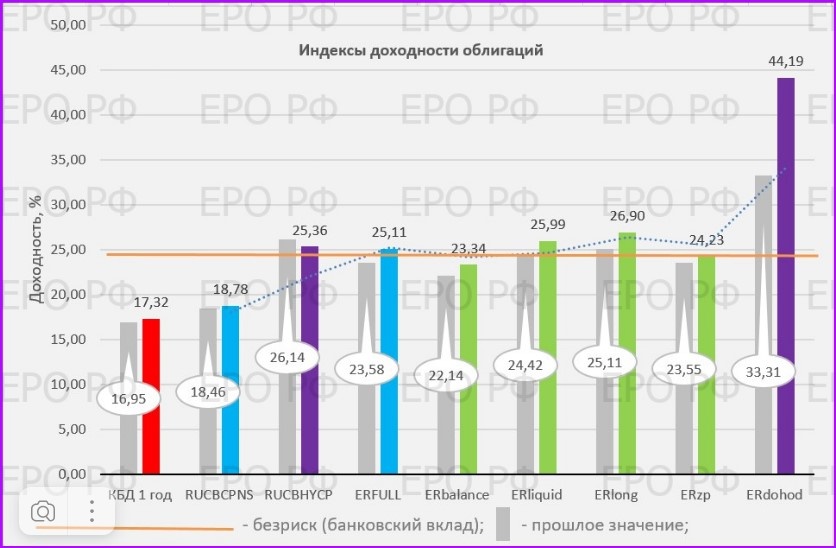Плановый обзор долгового рынка и обновленных портфелей. ✅ Максимальная процентная ставка по вкладам, публикуемая Банком России, на сайте регулятора значительно не изменилась и составила 17,27%; ✅ Индекс ОФЗ с дюрацией 1 год (КБД 1 год на графике👆) постепенно растёт, но очень медленно, ибо в теории должна равняться ключевой ставке. КБД публикуется на сайте Мосбиржи; ✅ Индекс корпоративных облигаций RUCBCPNS (публикуется на сайте Мосбиржи) почти не изменился; ✅ Индекс высокодоходных облигаций RUCBHYCP (публикуется на сайте Мосбиржи) - упал в доходности почти на процент, несмотря на реальную обстановку в рынке, что по меньшей мере странно и вызывает вопросы; ✅ Индекс полной доходности ЕРО РФERFULL значительно вырос. В Реестр вошло 97 облигаций против 119 ранее, общий порог YTM для попадания облигаций в ЕРО РФ не менялся; ✅ Индекс ERbalance портфеля СБАЛАНСИРОВАННЫЙ - значительно вырос; ✅ Доходность ликвидной части Реестра ERliquid - так же прибавил более процента; ✅ Индекс портфеля ДОЛГО