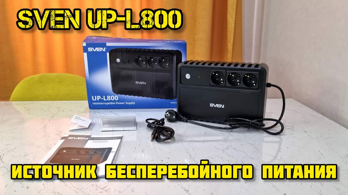 Здравствуй дорогой читатель! Много лет назад у нас был стационарный компьютер. Тогда у нас стоял ИБП, для того, чтобы защитить по тем временам очень редкую и дорогостоющую вещь. Теперь времена немного поменялись и случаи перепада напряжения стали не такими частыми, но все-таки случаются, не так давно в нашем доме подобный случай произошёл и соседи жаловались на вышедшую из строя технику. Поэтому решили вспомнить старые добрые времена и приобрести ИБП Взяли вариант от надежной финской компании SVEN, модель UP-L800 Технические характеристики Комплек состоит из: 🔘 ИБП На передней панели расположены 3 выходные розетки 🔘 Интерфейсный кабель Через USB порт для подключения к ПК с помощью специального ПО можно контролировать параметры ИБП, а также корректно завершить работу ПК. 3 LED индикатора 🟢 Режим работы от сети 🔴 Режим работы от инвертора 🟡 Режим АКБ Особенности ИБП SVEN UP-L800 ✔️ Цифровое управление на базе микропроцессора ✔️ Повышающий и понимающий AVR для стабилизации напр