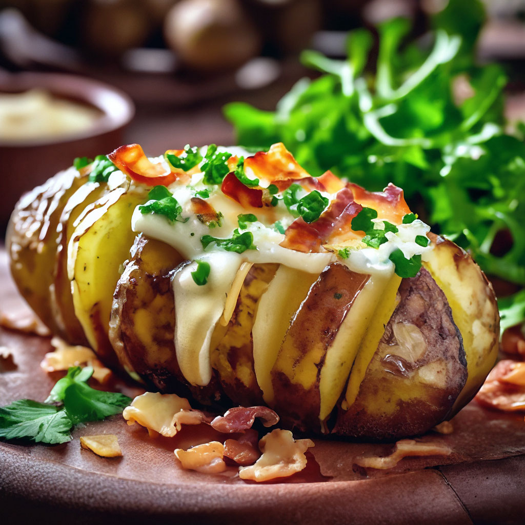 Картофель – 10 шт. Бекон – 300-350 г Сыр твердый – 250 г Масло оливковое – 2-3 ст. л. Сметана – 180 г Лук зеленый (нарезанный) – 1 ст. л. Соль – по вкусу Для запекания мы будем использовать крупный картофель с белой или желтой кожурой, который предварительно тщательно вымоем. Часть бекона нарезать кубиками. Оставшийся бекон нарезать полосками шириной 1,5-2 сантиметра. Сыр также нарезать полосками шириной 1,5-2 сантиметра. Острым ножом сделать надрезы на каждом клубне картофеля, не доходя до низа, используя для этого палочки для суши. В том случае, если у вас под рукой не окажется таких палочек, можно использовать карандаш или ложку. Нарезанный картофель тщательно промыть под проточной водой и обсушить. Подготовленный картофель аккуратно натереть оливковым маслом и посыпать солью. Половину картофеля начинить беконом: для этого в разрезы через один вставить по кусочку бекона. Весь картофель поместить на противень для выпечки, застеленный фольгой. Запекать картофель в духовке при температ