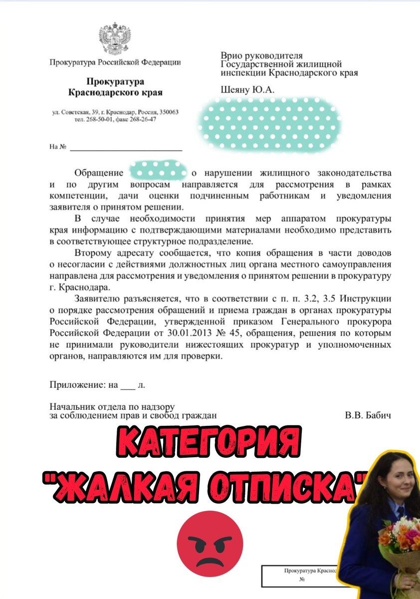 Здравствуйте, уважаемые подписчики и гости моего канала! Прежде чем, ознакомиться с настоящей публикацией, прошу Вас также ознакомиться с ранее выпущенными статьями на моём канале и станет всё понятно. Спасибо большое!: Заместитель начальника управления прокуратуры рассмотрел жалобу на своего начальника и, внезапно, "нарушений не нашел". Пишем жалобу в ГП РФ Заместитель начальника управления прокуратуры Кубани Н.Р. Пшипий повторно рассмотрел жалобу на своего же руководителя. Жалоба Благодаря бездействию прокуратуры, техподдержка портала ГИС ЖКХ рассмотрела мою жалобу "сама на себя". Результат - лишь извинение. Жалуемся Прокуратура необоснованно направила жалобу в техподдержку портала ГИС ЖКХ. Пишем жалобу в ГП РФ - начальник отдела по надзору по соблюдению прав и свободы граждан В.В. Бабич. - заместитель начальника управления по надзору за исполнением федерального законодательства Н.Р. Пшипий. В.В. Бабич, во внеочередной раз, в нарушении ФЗ №59 и приказа ГП РФ №45 перекинула мою жалобу