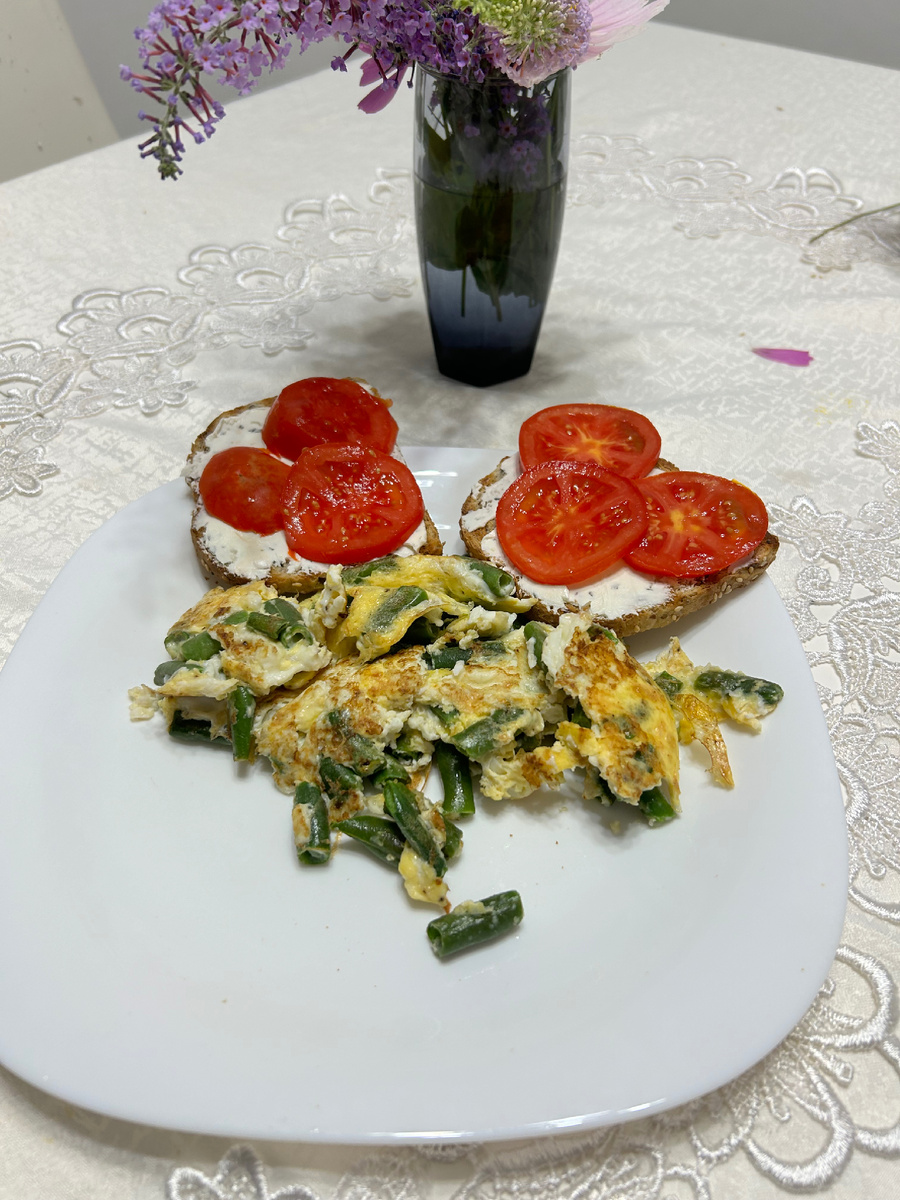 Завтрак — это важнейший прием пищи, который задает тон всему вашему дню. Если вы ищете что-то простое, вкусное и питательное, обратите внимание на мой рецепт: омлет с зеленой фасолью и брускетты с помидорами и творожным сыром с зеленью. Такое блюдо подарит вам заряд энергии и позаботится о вашем здоровье. Такой завтрак — отличный способ начать день с пользой для здоровья. Омлет с зеленой фасолью обеспечит вас белком и необходимыми витаминами, а брускетты с помидорами и творожным сыром добавят нотку свежести и приятного вкуса. Приятного аппетита!