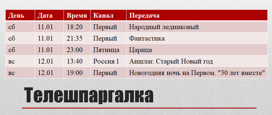 Здравствуйте! Составляю план работы дальше, делюсь с вами. Кроме наших традиционных и разных конкурсов, намечаются тоже традиционные игры по ТВ шоу. Я просматриваю программу, составляю шпаргалку, чтобы ничего не упустить. Вот что набросала себе на следующие выходные: Какие изменения в программе? Шоу "Фантастика" переместилось на субботу с обычной пятницы. В субботу же будем наблюдать за парами в "Народном ледниковом" и ещё за финалом "Царицы". Я не знаю, смогу ли за 1 день охватить три передачи. Скорее всего, нет. Значит посмотрю позже и расскажу о каких-то из них в воскресенье. Хотя планировала очутиться в повторах новогодних. Ну ладно, там разберёмся. Что касается начала долгожданных шоу, то новости такие. Уже известна дата выхода нового сезона шоу. 17 января в 21:30 на канале "Россия 1" мы будем смотреть первый выпуск. Читатели говорят, что шоу "Один в один!" интереснее, чем "Точь-в-точь!" Вот и посмотрим/сравним. Ведущие - Николай Басков и Клава Кока. Новый сезон "Маски" н