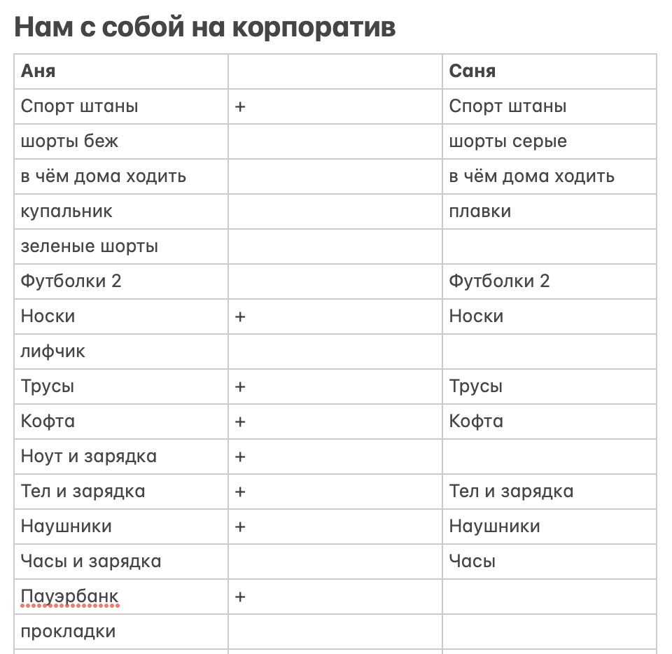 Возможно, вы помните, что я люблю писать списки вещей с собой в телефоне. Делаю это в заметках айфона, чтобы было под рукой и на телефоне, и на ноутбуке. Для одного человека (для себя или для Тима) делаю с возможностью проставлять галочки, а если пишу список сразу для нас с мужем — делаю табличку и ставлю плюсики. Так удобнее отслеживать, что уже положил и ничего не забывать. Пишу заранее, чтобы точно всё продумать и положить. Как это выглядит, вы можете посмотреть в карусели ниже. В Питер я ездила погулять с подругой и отдохнуть от мамских обязанностей всего на два дня, поэтому с собой брала только рюкзак. Но, чтобы оставить часть вещей в отеле положила с собой сумку. Сначала думала взять обычный шопер, но вспомнила про сумку, которую на прошлый Новый год получила от Дзена. Правда, она не застёгивается, это минус. Так как путь не близкий — в ту сторону почти 4 часа на «Сапсане», а обратно 5,5 на «Ласточке» — брала с собой ноутбук. И не зря: по пути домой написала статью и составила