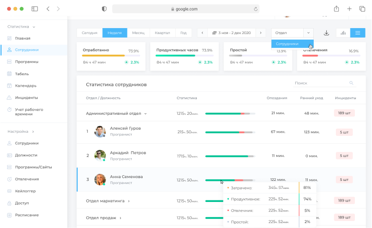 4.Имеет встроенную аналитику. Руководителям и сотрудникам не нужно тратить силы на подсчет времени вручную — ИНСАЙДЕР самостоятельно сводит собранные данные и представляет результаты в виде наглядных графиков и диаграмм. Например, программа сравнивает показатели коллег на одинаковых должностях и показывает, кто работает много, а кто отвлекается на личные дела.