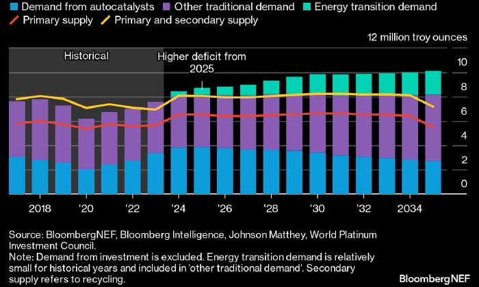 Производство водородных топливных элементов и электролизеров может поднять спрос на металлы платиновой группы более чем на треть в период с 2023 по 2035 год. Одновременно с этим, начиная с 2025 г., рынок будет сталкиваться с растущим дефицитом предложения, пишут аналитики Bloomberg NEF. Структура рынка платины: синим — спрос со стороны традиционной автомобильной промышленности (ДВС), фиолетовым — со стороны других традиционных секторов экономики, салатовым — со стороны технологий энергетического перехода, красная линия — предложение металла в первичной форме, желтым — совокупное предложение металла в первичной и вторичной формах в млн тройских унций в год. Источник: BloombergNEF С начала года платина подешевела примерно на 5%, а за последние десять лет — примерно на 35%. Цена золота за те же периоды времени прибавила около 21% и 95% соответственно. На этом фоне отношение золота к платине подскочило до 2,6х. Однако в ближайшие годы металлы платиновой группы (МПГ) могут начать новую жизн