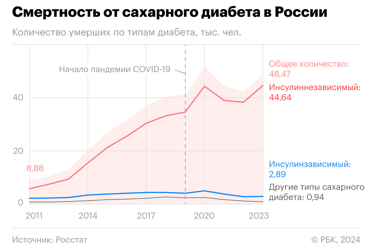 Всплеск числа умерших от сахарного диабета (сразу на 26%) произошел в 2020 году — год начала пандемии — и достиг пикового значения в 51,8 тыс. умерших, но затем в течение двух лет снижался. Текущий рост эксперты объясняют целой совокупностью факторов, среди которых отложенные последствия короновируса, рост числа людей с ожирением, способствующим развитию сахарного диабета, увеличение выявляемости этого заболевания и его учета при указании причин смертности.