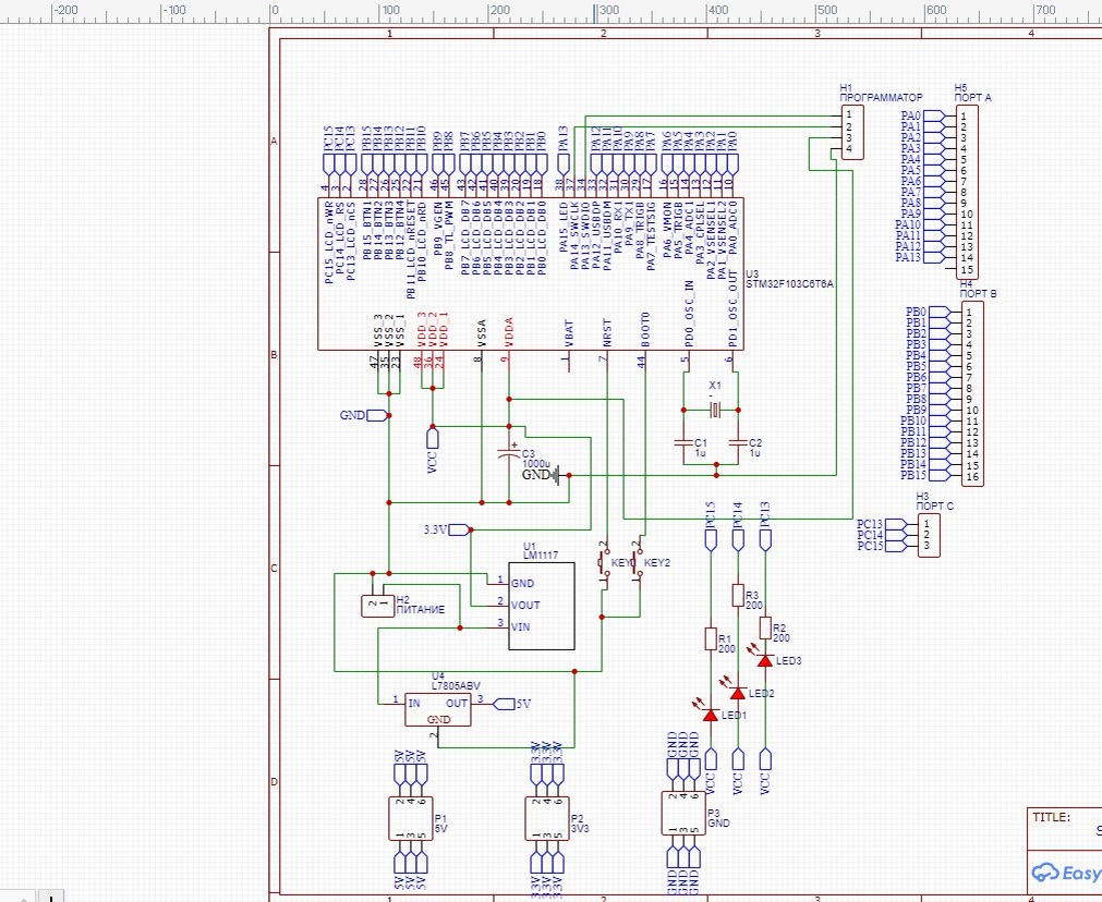 Всем привет! Наконец, спустя полгода выходит вторая часть по разработке своей отладочной платы на основе микроконтроллера stm32f103c6t6. И сегодня я покажу схему, которая у меня получилась, а также подробно объясню, зачем нужен каждый компонент на ней. Приступим. Итак, начнём по-порядку. 1) Самая главная часть нашей схемы - микроконтроллер. Как и говорил, f103c6t6. 2) Колодки H1, H3, H4, H5. Первая выступает в роли разъема для программатора, остальные - выводы пинов мк. 3) Кварц X1 и конденсаторы C1 с C2. Кварц - задаёт частоту работы мк, конденсаторы нужны для более стабильной работы. 4) Конденсатор C3. Нужен для устранения помех по питанию. 5) Колодка H2. К ней подключается питание. До 15В. 6) Стабилизаторы Lm1117(3,3В) и Lm7805(5В). Первый используется для питания мк и на выводах колодки P2, второй только на выводе колодки P1. 7) Собственно сами колодки P1, P2 и P3. Служат дополнительными выводами земли, 3,3В и 5В. 8) Две кнопки. Одна при нажатии замыкает NRST с землёй (пере