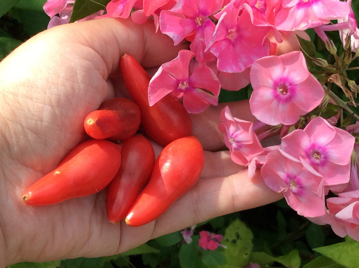 В этом и в прошлом сезоне выращиваю этот черри. Весной 2023 купила семена, потому что помидорчики понравились на картинке. Я раньше подобных не видела. Информацию о нем в интернете прочитала и на упаковочке. Отзывы были хорошие. Но, не очень удачно он получился у меня в прошлом сезоне. Долго спел, трескался, осыпался. Плод плотный и не очень сочный. Сладость была но я бы сказала, что средняя. Бывают черри значительно слаще. Вот такой был. Здесь он в сравнении с другими черри. Это прошлогодние помидорчики на томате. В этом году решила, что из семян другого производителя его посею. В этот раз вот такая упаковочка. Растет у меня в открытом грунте. Сформировала в 2 стебля. (Около одной опоры 2 кустика разных черри. Сделала так, чтобы побольше сортов уместилось и загущенность уменьшить.) Только в середине августа у меня начали первые помидорчики зреть. И в этом сезоне тоже он поздний у меня получается: Наверно его лучше в теплице выращивать, а не в открытом грунте. Помидорчики