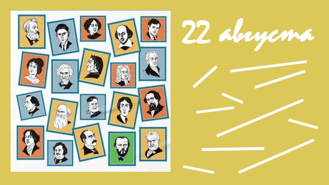 105 лет советскому поэту Михаилу Валентиновичу Кульчицкому (1919-1943) 95 лет литовскому поэту Альфонсасу Малдонису (Alfonsas Maldonis, 1929-2007) 85 лет российскому писателю Сергею Григорьевичу Козлову (1939-2010) 60 лет английской писательнице Диане Сеттерфилд (Diane Setterfield; 1964) русский поэт, переводчик К. Р., великий князь Константин Константинович Романов (1858-1915) шведский поэт Густав Фрёдинг (Gustaf Fröding, 1860-1911) американская писательница и поэтесса Дороти Паркер (Dorothy Parker, 1893-1967) советский писатель Леонид Пантелеев (настоящее имя — Алексей Иванович Еремеев, 1908-1987) советский писатель Анатолий Вениаминович Калинин (1916-2008) немецкий писатель Вольфдитрих Шнурре (Wolfdietrich Schnurre; 1920-1989) американский писатель Рэй Брэдбери (Ray Douglas Bradbury, 1920-2012) советский поэт Сергей Сергеевич Орлов (1921-1977) литовский поэт Альфонсас Моисеевич Малдонис (Alfonsas Maldonis, 1929-2007) советский писатель Владимир Ильич Амлинский (1935-1989) американ
