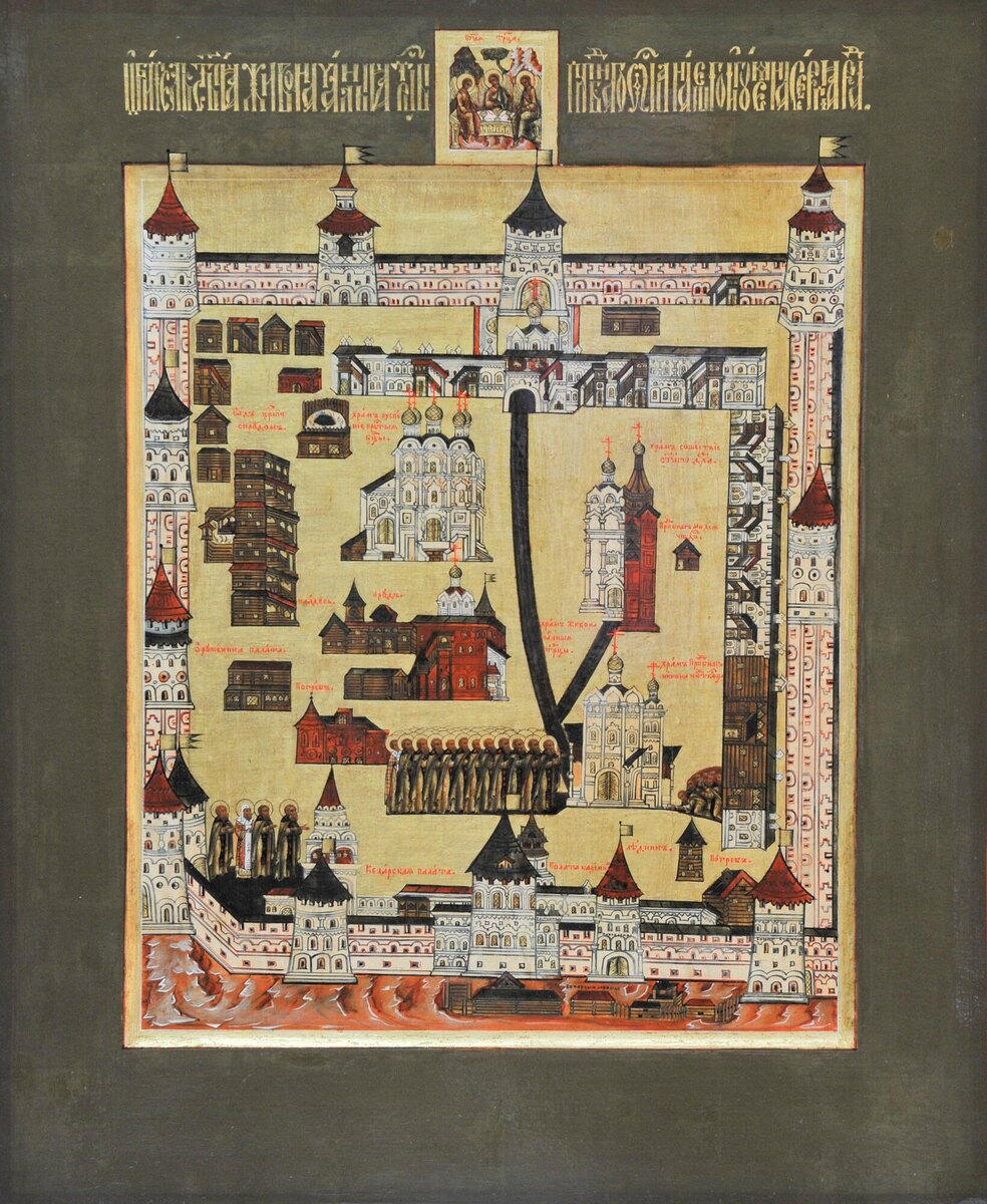 Сразу же обратим внимание на то, что на иконе изображена только одна дорога в пределах каменной ограды – от Красных ворот (в верхней части иконы) до Троицкого собора. Отметим и то, что такая же дорога изображена от церкви Сошествия Святого Духа к Троицком же собору.