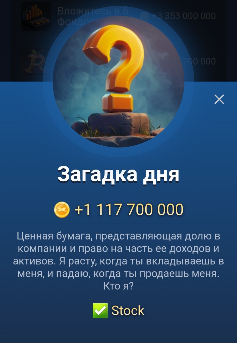 Ценная бумага, представляющая долю в компании и право на часть ее доходов и активов. Я расту когда ты веладываешь в меня, и палаю, когда ты продаешь меня. Кто я? Ответ: Stock Ребус: Loyalty Комбо ТУТ