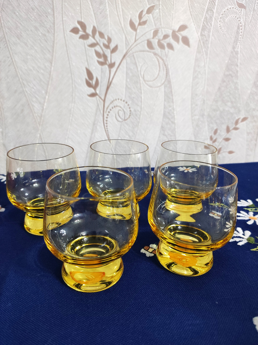Здравствуйте! Приветствую всех на своём канале! Как любитель советской посуды не могу обойти своим вниманием посуду из цветного стекла) У моих родителей было очень много посуды: фарфор, хрусталь, стекло. Мама часто покупала именно стеклянную посуду (рюмки, стаканы, фужеры). Хрусталь тоже был, но не много, достать его было сложнее, да и стоил он намного дороже. Очень любила в детстве помогать маме накрывать стол, особенно по праздникам и почему-то всегда ставила не хрусталь, а цветное стекло, очень мне нравились разноцветные рюмочки и фужеры) Той посуды сохранилось не так много, ею активно пользовались и родители и мы, а я теперь храню оставшиеся дорогие мне предметы. Вот такие бокалы или рюмки для крепких напитков, сохранилось к сожалению только 5 штук, было 12 Жёлтое цветное стекло, увесистые, очень приятно брать в руку, они 60-х годов И сейчас, бывает их используем А это коньячные рюмки из янтарного стекла, мама покупала в конце 70-х годов Им почти 50 лет Сохранились очень хорошо, в