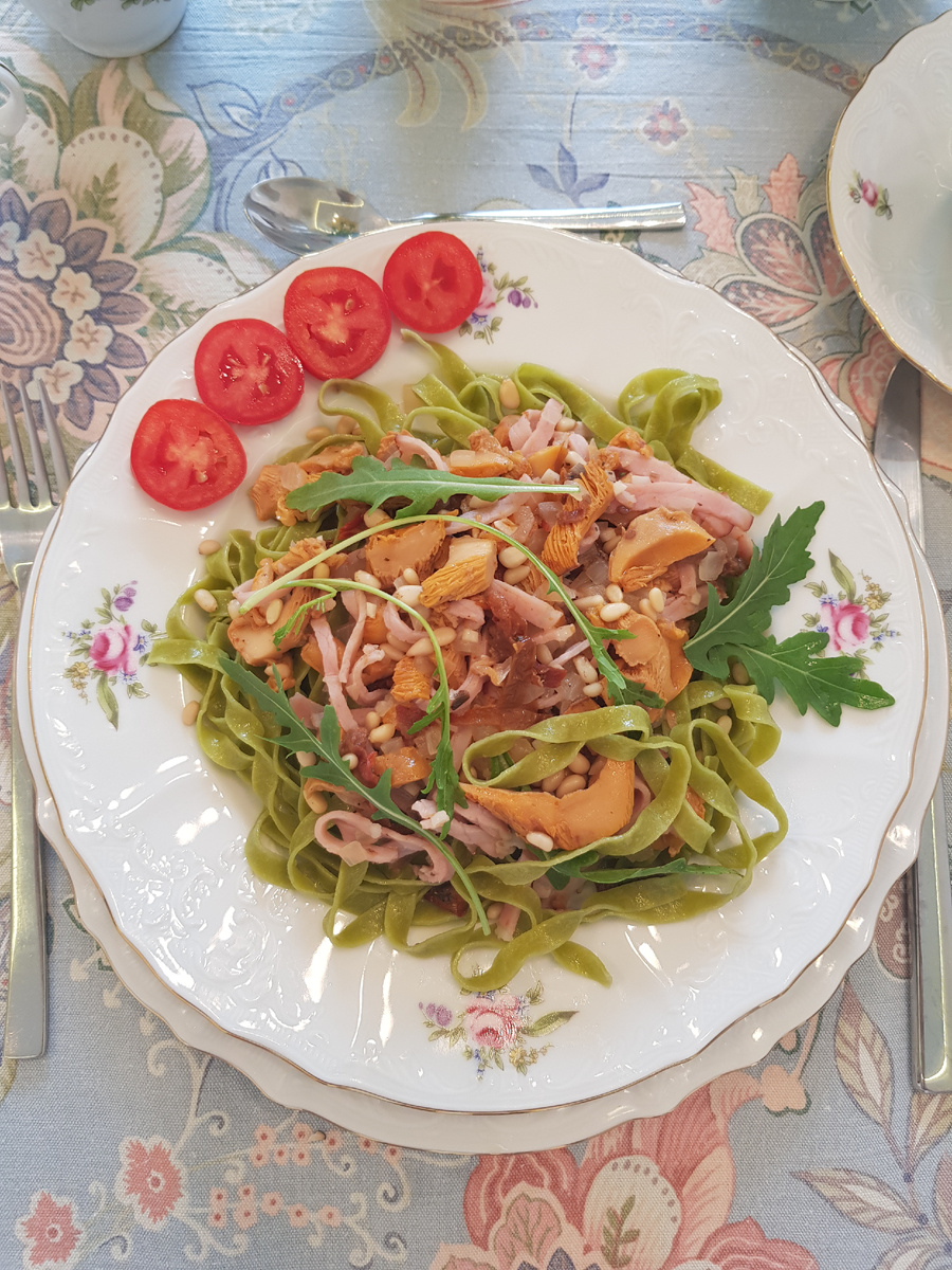 Для приготовления нам понадобятся: 250 грамм макарон тальятелле алл'уово со шпинатом, 300 грамм грибов лисичек, 150 грамм сырокопченой свинины, 6 штук вяленных томатов в масле, 2 зубчика чеснока, 1 луковица, 10 грамм салата руккола, 3 столовые ложки ядер кедрового ореха, 3 столовые ложки масла из-под помидоров, 1/2 чайной ложки соли, 1/8 чайной ложки черного молотого перца, помидоры свежие для сервировки.