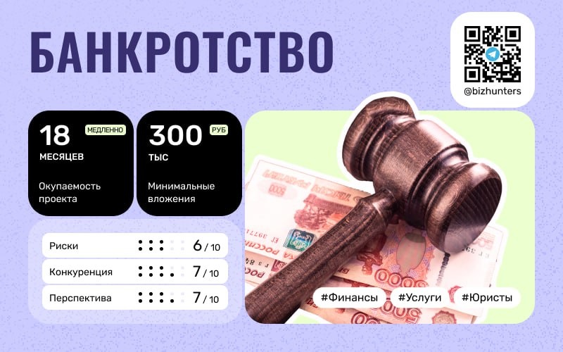 Помощь в банкротстве физиц как бизнес: сколько нужно вложить, когда окупятся инвестиции, пошаговый план запуска своей фирмы. Суть бизнеса: По закону с 2015 года объявить себя банкротом может любой человек, имеющий больше 500 тысяч рублей долгов. Без посторонней помощи провести процедуру практически невозможно, поэтому в этой сфере вырос целый сегмент бизнеса. Зарабатывают такие фирмы на платных юридических услугах – от консультаций до полного сопровождения. Банкротство может быть обычным (через арбитражный суд) и внесудебным (бесплатно через МФЦ). С внесудебным помогать особо нечем, поэтому сконцентрируемся на стандартных процедурах банкротства. Примеров много – по запросу «банкротство в [название города]». Есть даже целые агрегаторы таких фирм, которые ведут рейтинги и собирают отзывы. Порог входа: средний. Нужно зарегистрировать фирму, арендовать офис и нанять персонал. А дальше – только искать клиентов и работать с ними. Риски: законы в сфере банкротства иногда меняются, пройти проц