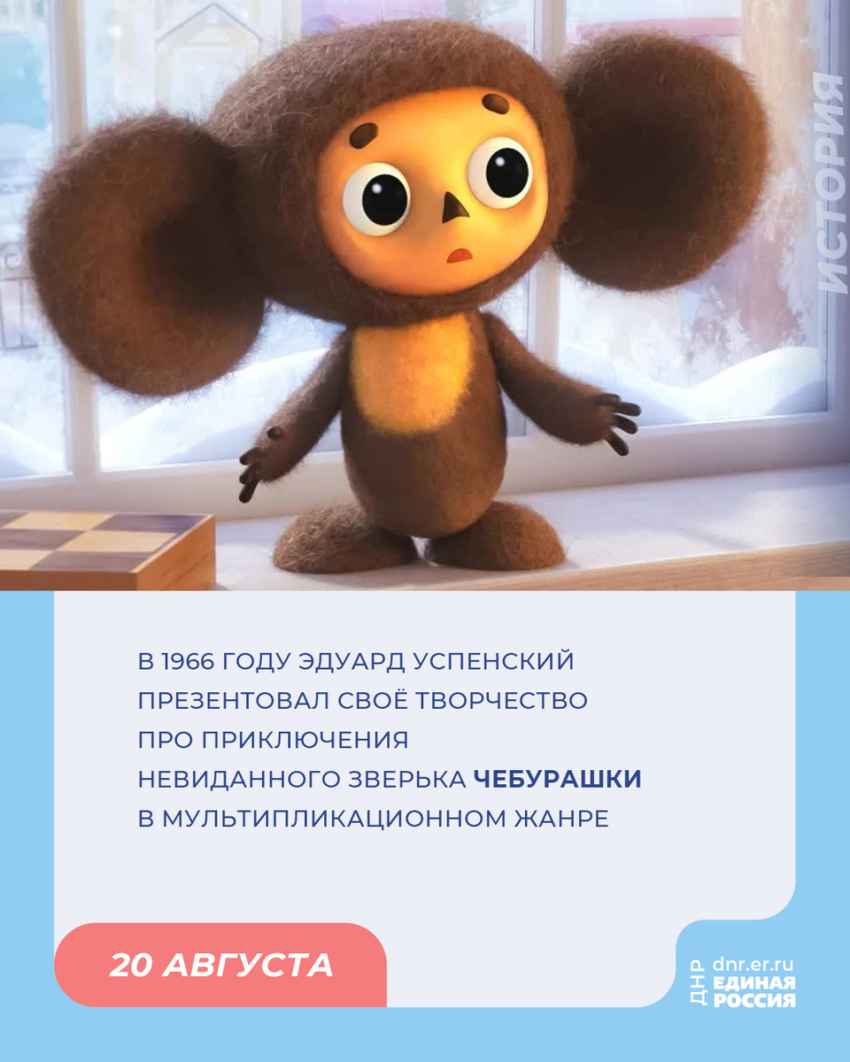 Официальным днём рождения Чебурашки принято считать 20 августа 1966 года: именно в этот год Эдуард Успенский презентовал своё творчество про приключения невиданного зверька в мультипликационном жанре.