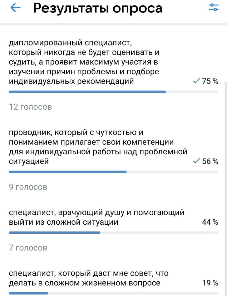 - "дипломированный специалист, который никогда не будет оценивать и судить, а проявит максимум участия в изучении причин проблемы и подборе индивидуальных рекомендаций" - 75% участников.