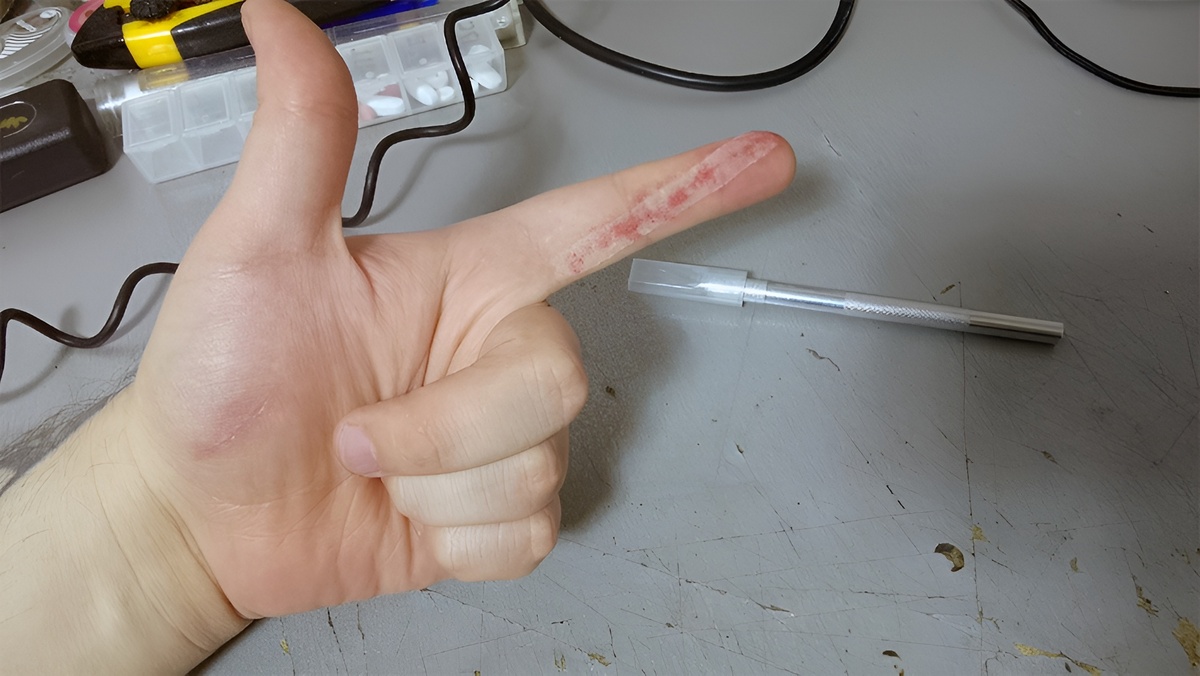 Как же неприятно, когда руку выворачивает именно во время работы!! Как обычно и как всегда: придерживаю линейку, режу кусок кожи и, бац! Судорога во всей ладони правой руки. Да так что скальпель проходит по указательному пальцу левой ладони от ногтя, до самой кисти. Снова его остановила кость! Звук был будто на пол уронил мокрую разделочную доску. Сейчас очень неудобно печатать одной рукой, из чего следует, что статью об учебе я на завтра не успею. Но, большое спасибо, что рука под лезвие попала именно левая и, что лезвие было не самым свежим. Возможно, из-за заступления лезвия, рана получилась частично рваной и от того заживёт она быстрее. Дома я был один и лейкопластырь с бинтом я не нашёл. Было принято экстремальное решение! При помощи ватного диска и спирта, Евгений расширил "словарный запас" соседям за стеной. А потом, то, что я делал уже очень много раз: суперклей и туалетная бумага! Максимально сжимаем рану, чтобы она не кровила. По линии раны наносим полосу суперклея, а дальше