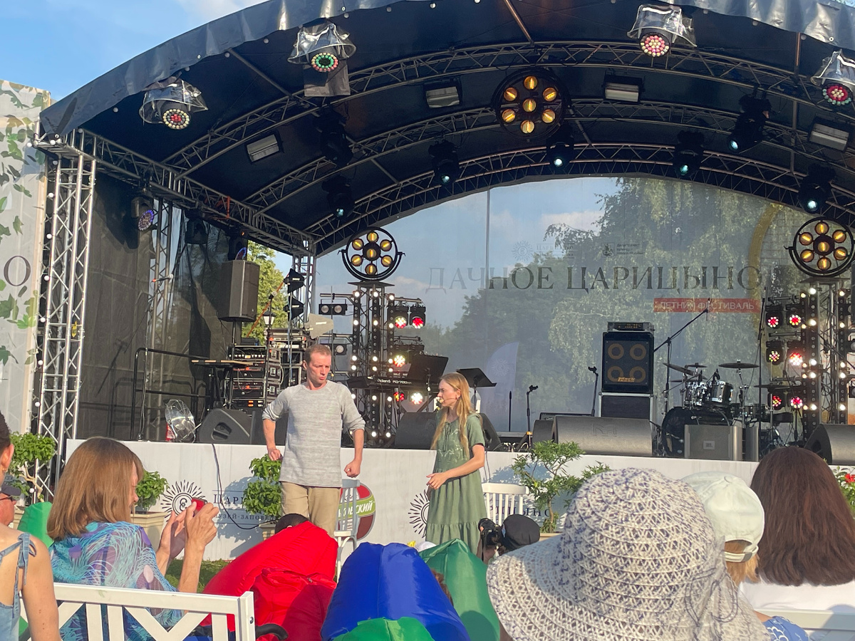 Еще расскажу немного о фестивале Дачное Царицыно, который проходил в этом году с 12 по 21 июля. Уже писала о спектакле "Это просто космос какой-то" от театра сторителлинга Константина Кожевникова, в котором он сам принимал участие. Но, как оказалось, он не одинок в своем театре :) Есть и другие актеры :) В другой день мы посмотрели прекрасную постановку для детей "Сказ о Петре и Февронии". Это легенда, рассказанная двумя актерами, перед нами выступали Евгений Пеккер и Александра Люц. Как говорится, в этой истории было все :) Здесь и сюжет о борьбе героя со змеем, и мудрая дева, сюда вплетено множество кусочков разных сказок и мифов. Актеры просто прекрасные, так замечательно взаимодействовали с публикой, особенно с детьми, которые постоянно подбегали и пытались не вовремя поучаствовать в спектакле (позже были моменты, когда, наоборот, они были нужны для развития сюжета). Так ловко отправляли малышей на места, не обидно, смешно и вписывали это в свой рассказ. Мы сначала отнеслись немн