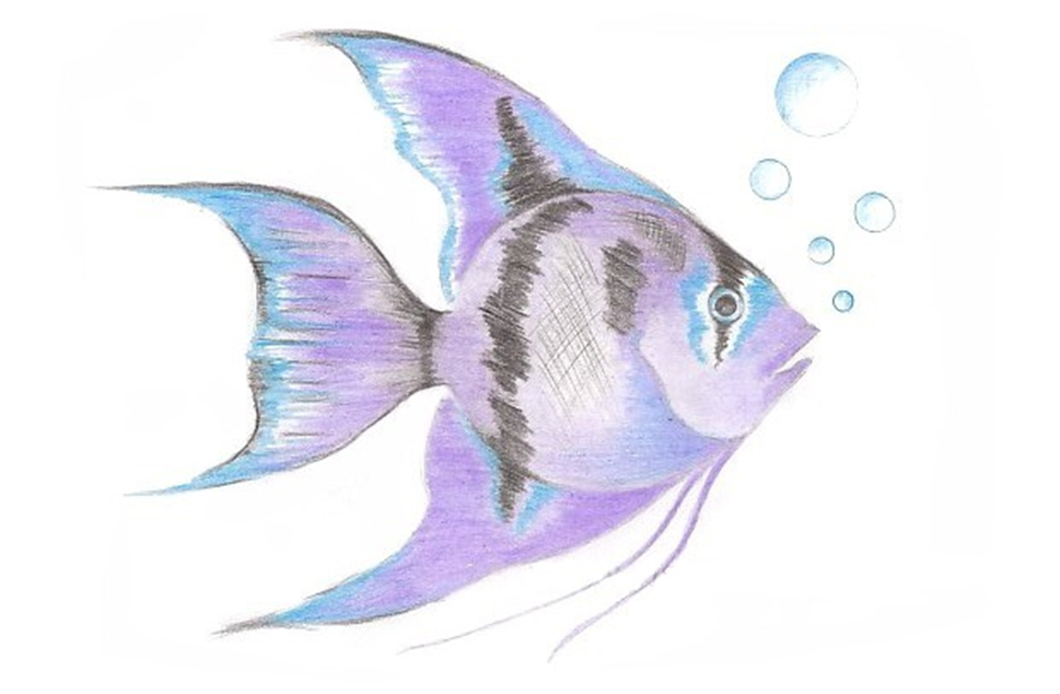 Начнем урок как нарисовать рыбку с построения туловища. В основе формы туловища лежит круг поэтому, начертив его, вы сможете легко нарисовать форму туловища рыбки. Далее нарисуем глаз, жаберную крышку и рот. Переходим к рисованию хвоста рыбки. Обратите внимание, что по высоте он такой же как и туловище. Хотя аквариумные рыбки бывают абсолютно разных форм и поэтому, вы можете нарисовать хвост больше туловища – это не будет ошибкой. Нарисуйте далее плавники — крылья аквариумной рыбке. Их два – один сверху, другой снизу. По форме и высоте они примерно одинаковые. Мы закончили первую часть урока как нарисовать рыбку поэтапно. Вторая часть будет посвящена раскрашиванию аквариумной рыбки. Здесь все зависит от полета вашей фантазии! Вы можете придумать какую-то свою цветовую гамму рыбке, а можете раскрашивать вместе со мной теми же цветами, что и я. Сначала я возьму карандаш черного цвета и наведу им контуры рыбки в некоторых местах. Внимательно посмотрите рисунок ниже и попробуйте повтор