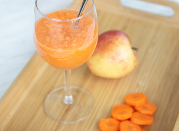 - Измельчить до однородной массы (если блендер не справляется – предварительно натрите морковь и фрукт на тёрке)