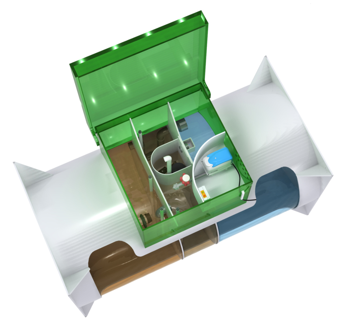 Горизонтальный АКВАЛОС представляет собой аэрационную установку глубокой биологической очистки сточных вод , которая очищает воду до 98 %, в соответствии с санитарно-гигиеническими и экологическими требованиями. Полученную воду применяют для полива растений, отводят в дренажную канаву. Образовавшийся в процессе переработки ил, переносят в компостную яму и используют в качестве удобрения. При выборе конструкции септика руководствуются: Горизонтальный АКВАЛОС – станции цилиндрической формы, с залповым сбросом от 200 до 800 литров, глубина подводящей трубы – до 30 см. Горизонтальный септик является оптимальным выбором при высоком уровне грунтовых вод на участке. Горизонтальный септик АКВАЛОС укомплектован дренажным насосом. Главным преимуществом станций биологической очистки сточных вод АКВАЛОС является простота и надёжность конструкции, минимальное количество энергозависимых устройств. Горизонтальный АКВАЛОС представляет собой аэрационную установку глубокой биологической очистки ст