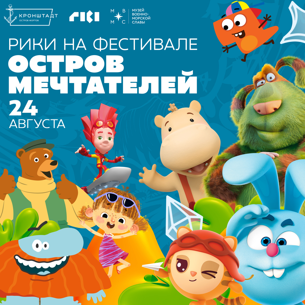 В субботу 24 августа приглашаем в кластер «Остров фортов» на встречу с любимыми мульт-проектами! Смешарики и Малышарики, Фиксики и Финник, Бодо Бородо и динозаврики из ДиноСити, Тима и Тома и настоящий тревел-блогер Медведь-Краевед готовы встречать гостей.