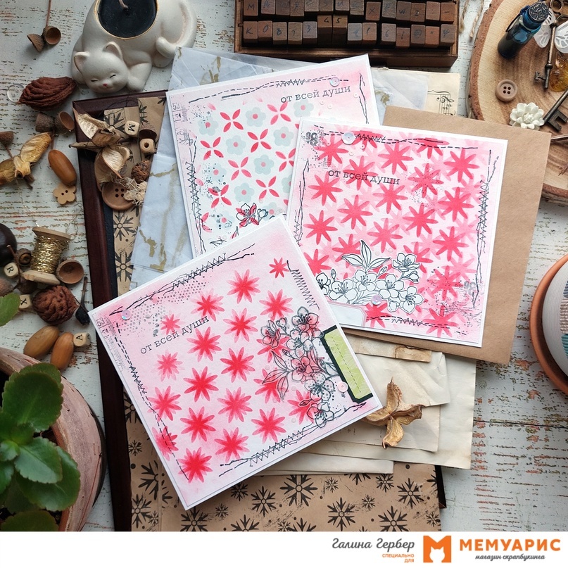 Когда совершаешь добрые дела, внутри возникает прекрасное чувство. Доброта распространяется на всех – на пожилых и молодых, на каждое живое существо. Творить добро так просто. Всем привет! С вами Галя. Сегодня я спешу вдохновить вас на добрые открытки. Всегда ждем вас в благотворительном проекте #добрыеоткрытки_мемуарис! Присоединяйтесь, творите добро с нами! Создала этих малышек я с помощью наборов трафаретов от KatrinCraft №1 и №2. У меня пока небольшая коллекция штемпельных подушечек, поэтому я выбрала два цвета, сочетающихся между собой. Это «Леди Баг» и «Bahama Blue». Очень жду, когда в Мемуарис будет новое поступление. В основе обычные акварельные листы. Для нанесения чернил на бумагу я использовала кисть для растушёвки. Рассмотрим каждую открытку поближе. На созданные мной фоны я добавила штампинг. В деле штампы от Agiart, назову несколько: «Важные акценты», «Многоточие», «Энтомология №2», «Надписи №10». Для акцентов использовала пайетки разных размеров. Открытки смотрятся интер